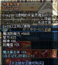Lv55以上可以使用 魔法防御力+5605 智力+27 精神+66 抗魔值+25 魔法暴击率+4% (远古记忆)技能Lv+3 |