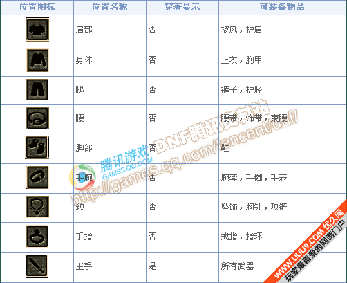 功能型装备共有9个装备位置,分别对应不同的部位,除了主手武器以外都不显示穿着。