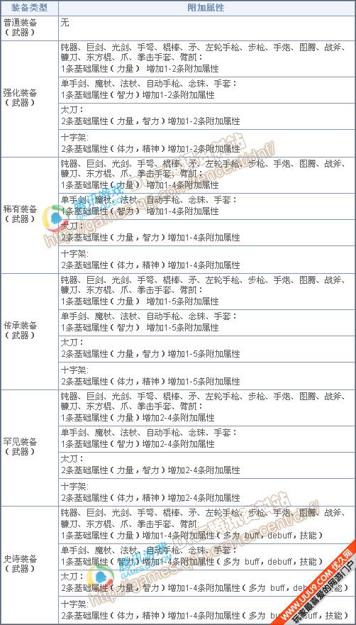 武器稀有度附加属性列表